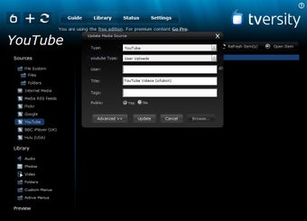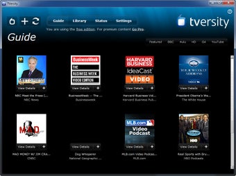 En la versión gratuita, TVersity también ofrece la posibilidad de visualizar contenidos online, de canales americanos principalmente; así como compartir contenidos vía RSS de Flickr, YouTube, la BBC (Reino Unido) y Hulu (USA).